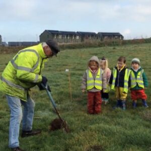 Photograph of tree being planted by Malcolm Gray with local children from Ysgol Penrhyn Dewi Va. Trees supplied by The Conservation Volunteers and Coed Cymru. Credit: Ysgol Penrhyn Dewi VA.